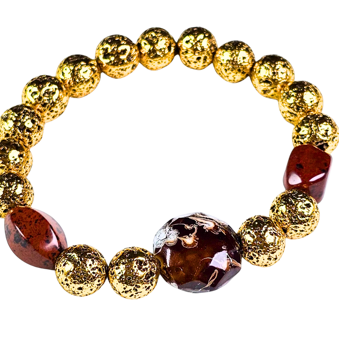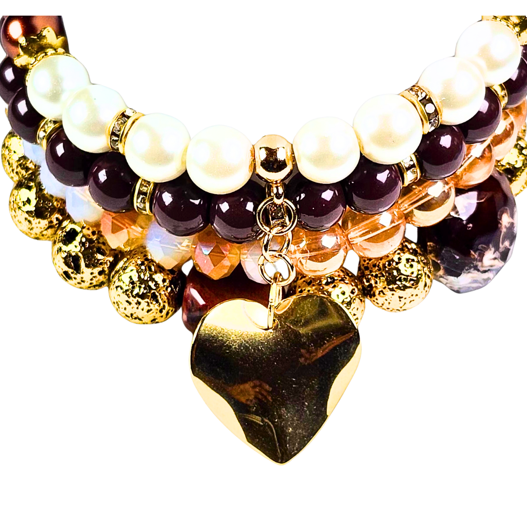 Get ready to elevate your accessory game with our Extravagant Brown Bead Bracelet Set #2. This 4-piece set is handcrafted to perfection, featuring a unique combination of brown and cream faux pearls, iridescent crystal beads, gold plated lava stones, and a stunning heart-shaped charm. The beads, stones (including charm) sizes ranges from 8 mm - 20 mm). One size fits most, making it the perfect addition to any outfit. Don't miss out on this exquisite must-have set. Absolutely stunning in person!